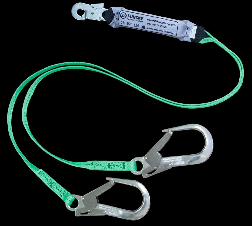 ∙ Integrierter Bandfalldämpfer ∙ Hohe Fangstoßabsorbierung ∙ Robustes zweistrangiges Polyesterband, 27 mm breit ∙ Mit Alu-Rohrkarabinerhaken Typ FS 90 ∙ Zugelassen nach EN 354:2010 und EN 355:2002 ∙ Kantengeprüft (horizontale Verwendung zulässig) ∙ Für Anwendergewicht 50-140 kg