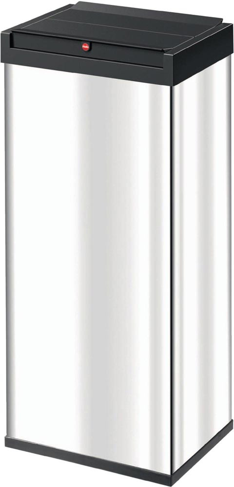 Inhalt 52 l · Deckel und Boden aus hochfestem schwarzem Kunststoff · Gehäuse aus Edelstahl · zweigeteilter Schwingdeckel schließt selbstständig, Verrastung zum kompletten Öffnen des Schwingdeckels möglich · mit Müllbeutel-Klemmrahmen · Boden mit 4 Anti-Rutsch-Füßen · Lieferung erfolgt zerlegt, einfache Montage