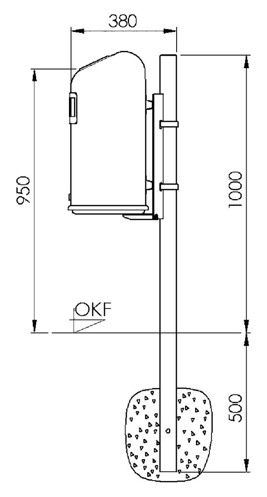 ∙ Gefertigt aus Stahlblech mit angeschweißter Befestigungsschiene ∙ Geeignet zur Wand- und Pfostenmontage ∙ Volumen ca. 45 l ∙ B x T X H 425 x 330 x 590 mm ∙ Gewicht inkl. Befestigungsschiene ca. 8,5 kg ∙ Ohne Aufkleber "Saubermännchen" ∙ Mit Ascher