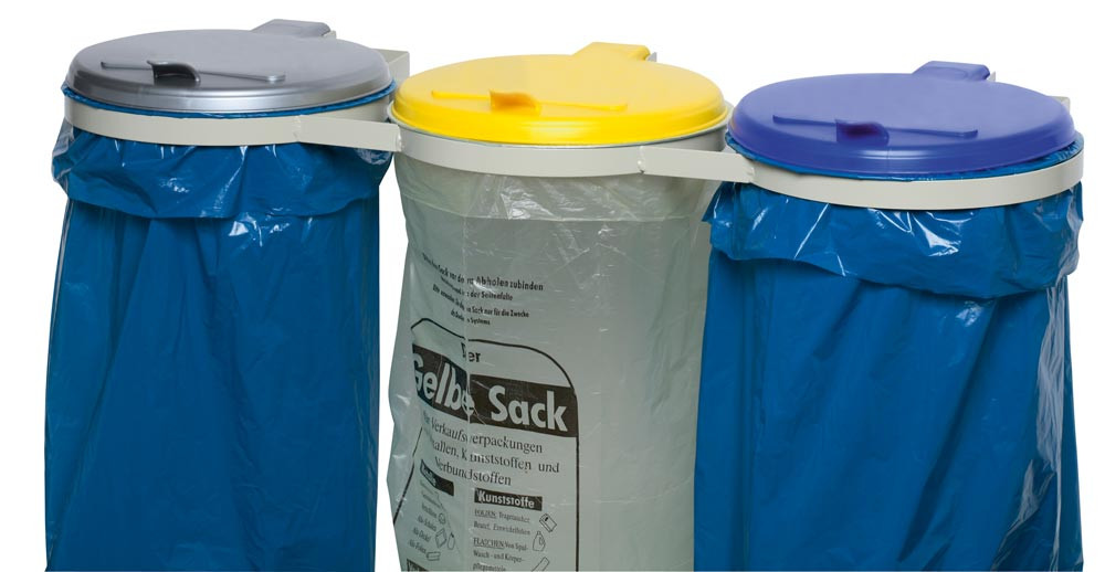 Abfallsammler 3-Fach, wandmont. eisenglimmer, Deckelsilber, gelb und blau Kunststoff, BxTxH 1200x510x70 mm E812099