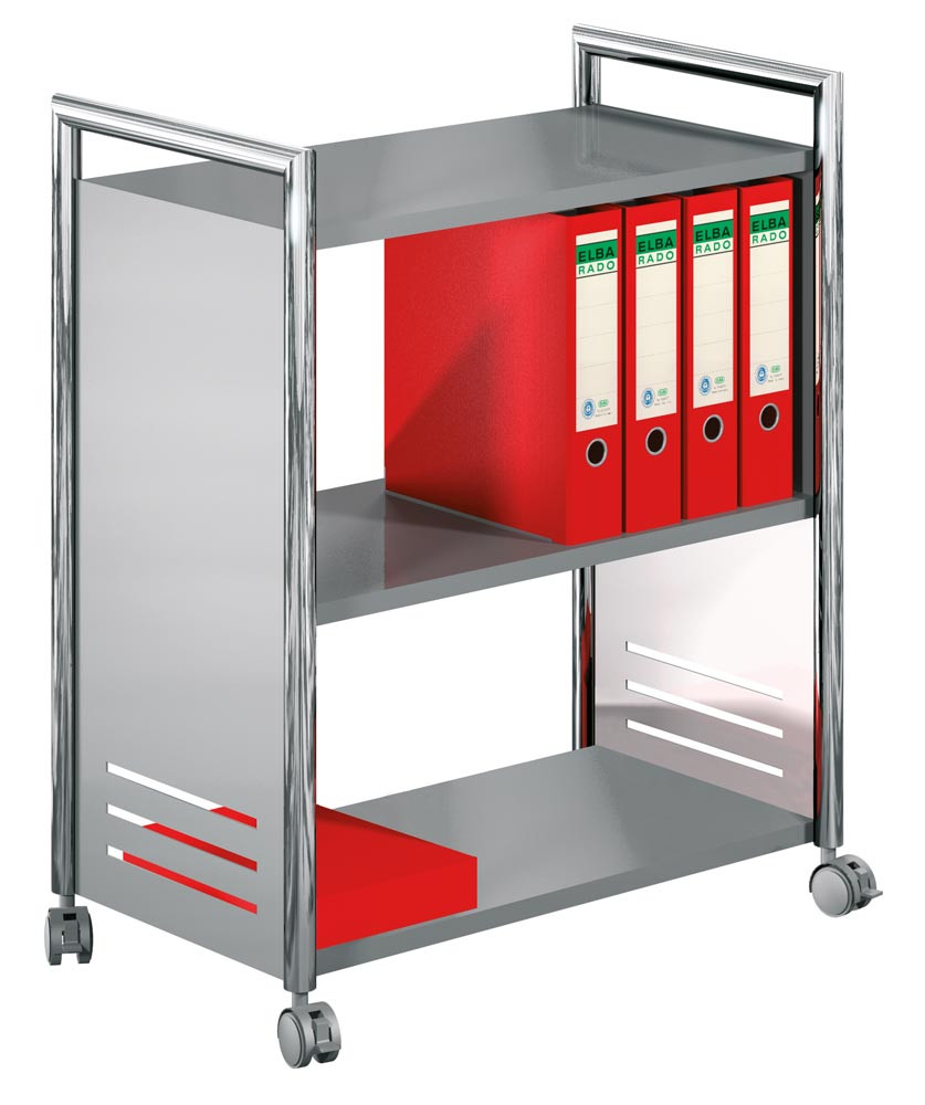 · Büro-und Aktenwagen · Hohe Belastbarkeit und Mobilität · Stabile Stahlkonstruktion · Fahrbar auf 4 Zwillingsrollen mit Feststellern · Farbe Chrom/Silber