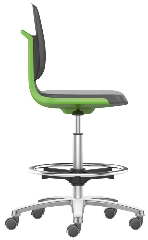 Arbeitsdrehstuhl mit Flex-Rückenlehne u. Sitzkante, Sitzschale grün, Sitz Kunstleder schwarz, Rollen u. Fußring, Sitz Höhe 560-810 mm