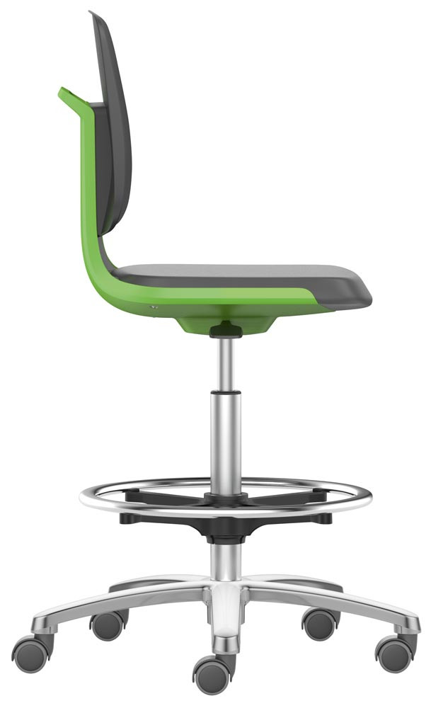 Arbeitsdrehstuhl mit Flex-Rückenlehne u. Sitzkante, Sitzschale grün, Sitz Stoff schwarz, Rollen u. Fußring, Sitz Höhe 560-810 mm