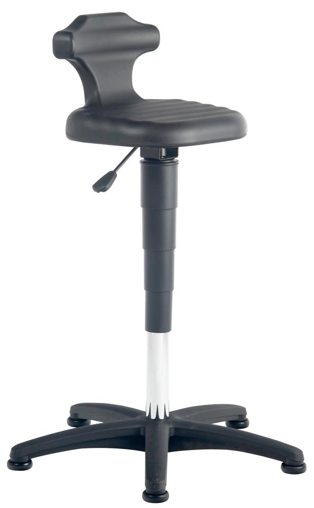 · Die innovative Lösung für Sitz- und Steharbeitsplätze · Extragroßes und stufenlos einstellbares Höhenspektrum mittels Gasdruckfeder · Sitzfläche um 360° drehbar mit SoftTouch PU-Schaum · Gefertigt nach DIN 68877 · Varianten mit Gleitern, Rollen und Fußring erhältlich