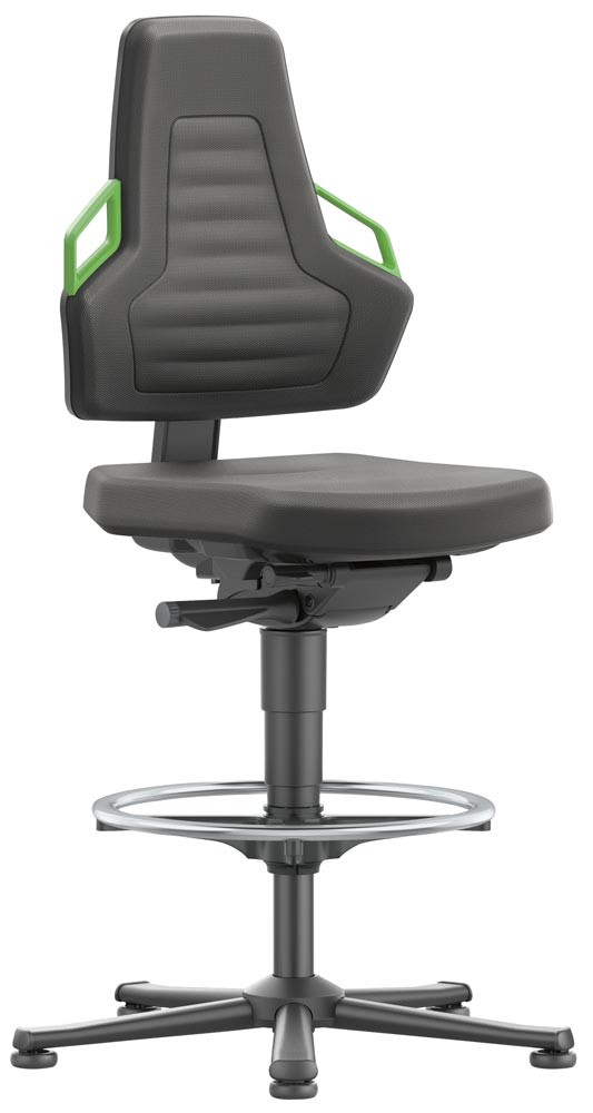 Arbeitsdrehstuhl mit autom. Gewichtregulierung, Sitz Supertec schwarz, Griffe grün, Gleiter u. Fußring, Sitz Höhe 570-820 mm