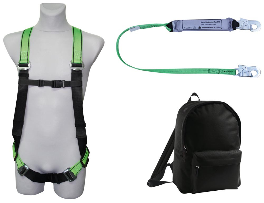 Auffangset bestehend aus: einfacher Auffanggurt, Verbindungsmittel m. Stahlkarabiner, Rucksack