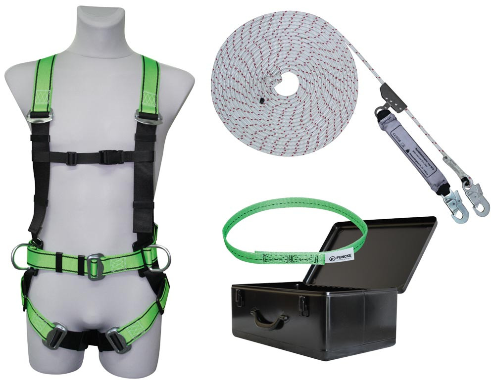 Auffangset bestehend aus Auffanggurt, mitlaufende Aufanggerät Seillänge 15 m, Bandfalldämpfer, Bandfallschlinge und Blechkoffer