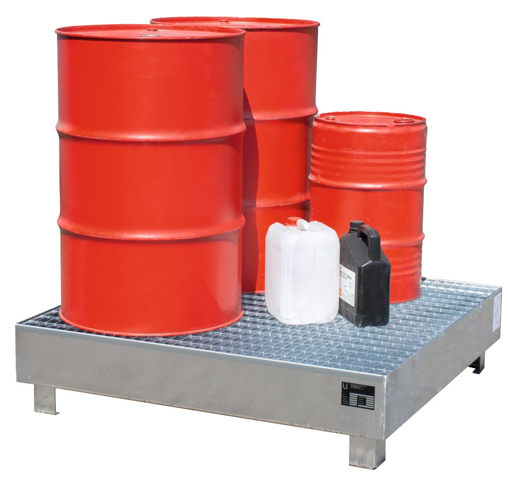 Auffangwanne, CO2 neutral, BxTxH 1200x1200x290 mm, Auffangvolumen 216 l, 4x200-l-Fass, mit Gitterrost, verzinkt E6423100