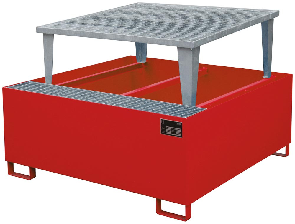 Auffangwanne, Stahl, Auffangvolumen 1000 l, BxTxH 1460x1460x1090 mm, mit Abfüllaufsatz, RAL 3000 E865682