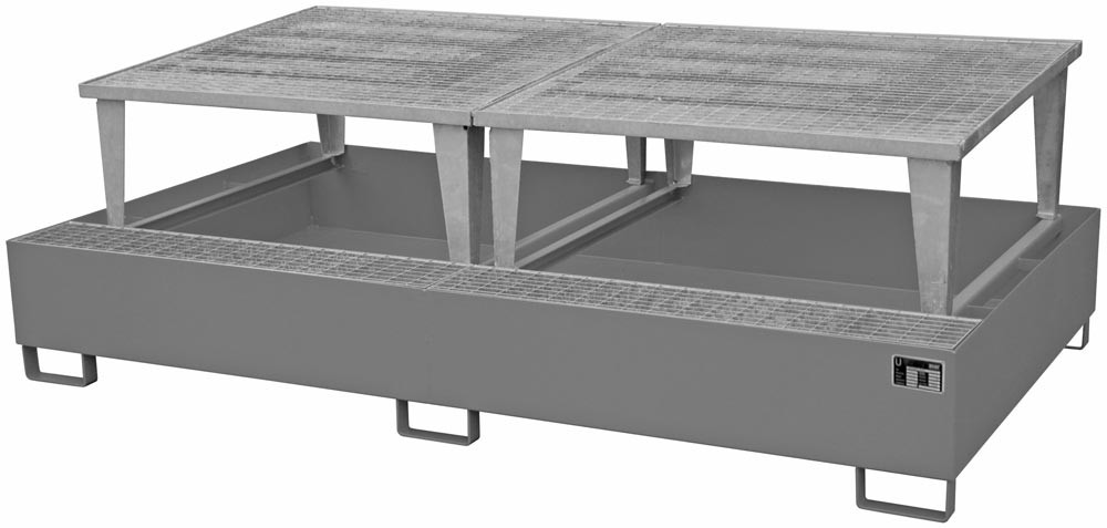∙ Auffangwannen aus 3 mm Stahlblech mit verzinktem Gitterrost ∙ Auffangvolumen 1000 Liter ∙ Stützfüße 100 mm Unterfahrhöhe