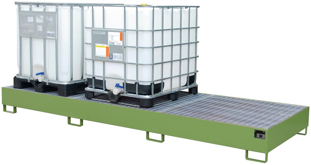 ∙ Auffangwannen aus 3 mm Stahlblech mit verzinktem Gitterrost ∙ Auffangvolumen 1000 Liter ∙ Stützfüße 100 mm Unterfahrhöhe