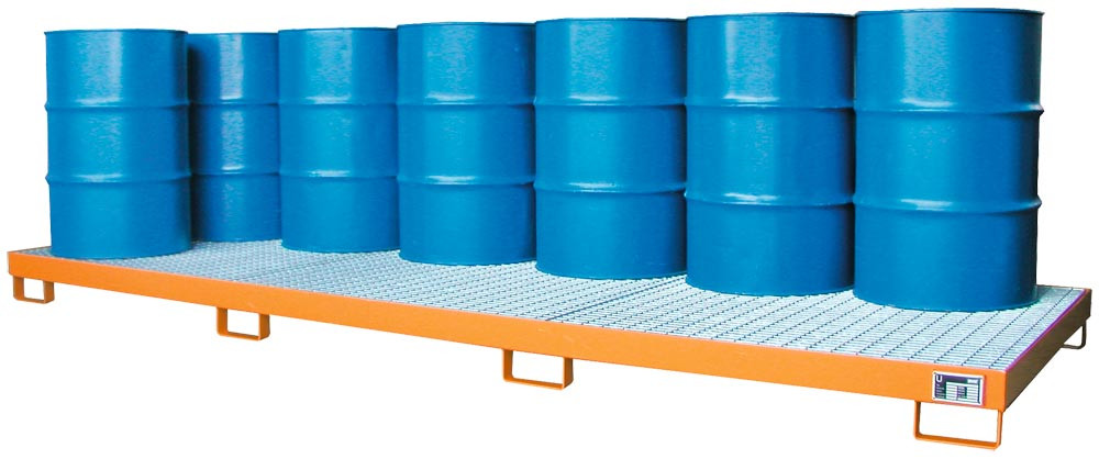 Auffangwanne aus 3 mm Stahlblech, RAL 2000, für 12 Stück 200-l-Fass, stehende Lagerung, 333 l, BxTxH 3850x1300x200 mm, mit Gitterrost verz.
