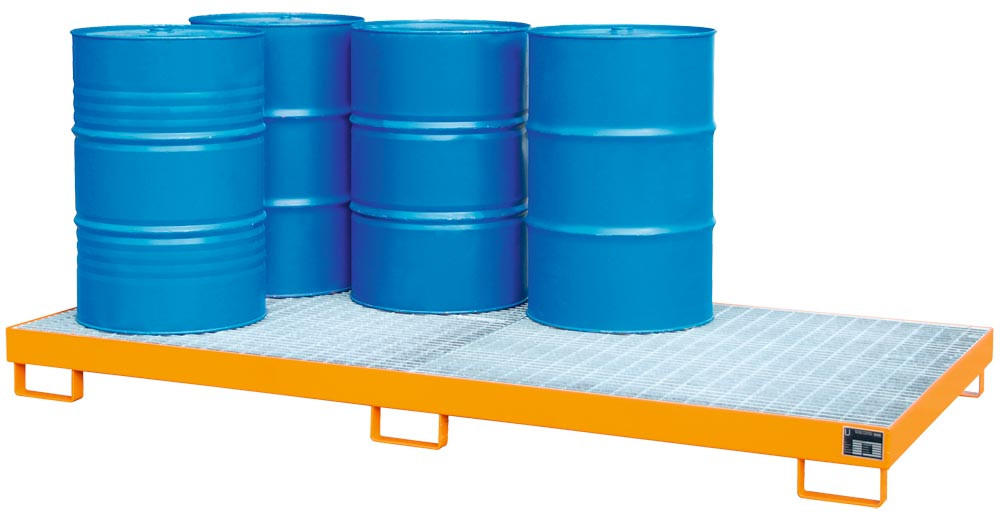 Auffangwanne aus 3 mm Stahlblech, RAL 2000, für 8 Stück 200-l-Fass, stehende Lagerung, 240 l, BxTxH 2650x1300x210 mm, mit Gitterrost verz.