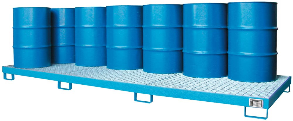 Auffangwanne aus 3 mm Stahlblech, RAL 5012, für 12 Stück 200-l-Fass, stehende Lagerung, 333 l, BxTxH 3850x1300x200 mm, mit Gitterrost verz.