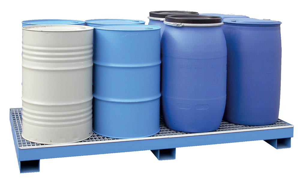 Auffangwanne aus 3 mm Stahlblech, RAL 5015, für 8 Stück 200-l-Fässer, stehende Lagerung, Wannenvolumen Auffangvol. 210 l, BxTxH 2400x1220x210 mm E6017754