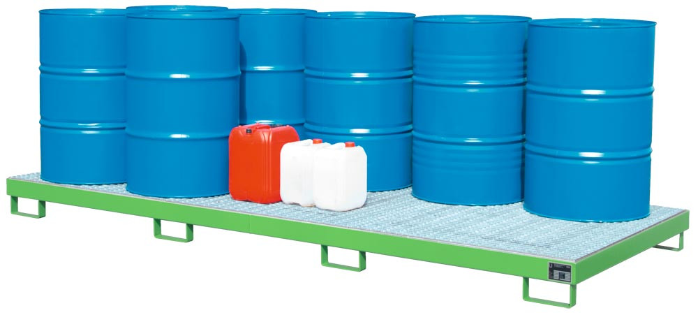 ∙ Aus 3 mm Stahlblech ∙ Mit verzinktem Gitterrost ∙ Stützfüße mit 100 mm Unterfahrhöhe ∙ Wahlweise feuerverzinkt oder mit hochwertiger Lackierung ∙ Zur Lagerung von 200-l-Fässern, auch mit 60-l-Fässern und Kleingebinden kombinierbar