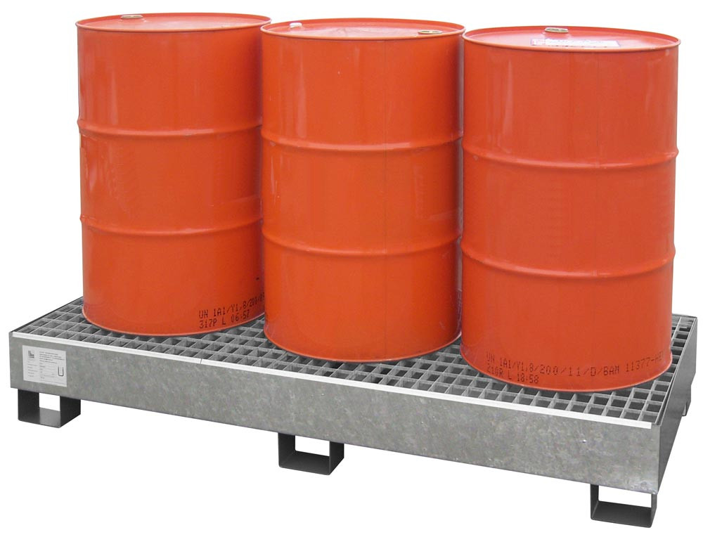 Auffangwanne aus 3 mm Stahlblech, feuerverzinkt, für 3 Stück 200-l-Fässer, stehende Lagerung, Wannenvolumen Auffangvol. 210 l, BxTxH 1850x820x270 mm