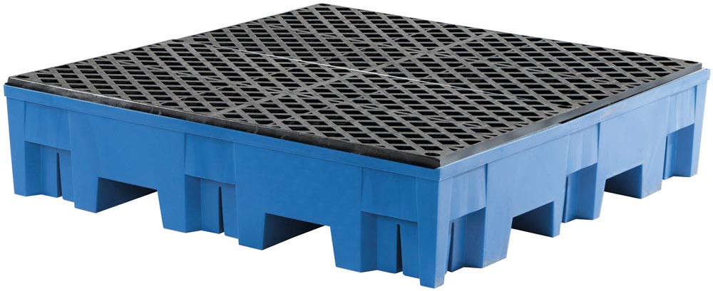 Auffangwanne aus Polyethylen, mit verz. Gitterrost, Volumen 295 l, BxTxH 1235x1235x275 mm, für 4 Fässer, blau, mit Einfahrtaschen E1988265