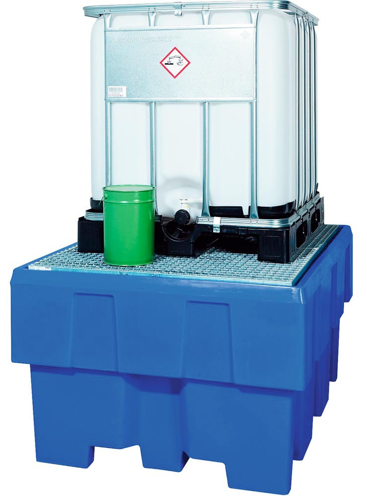 Auffangwanne aus Polyethylen für IBC, verz. Gitterrost, Volumen 1000 l, BxTxH 1280x1660x870 mm, für 1 IBC, blau