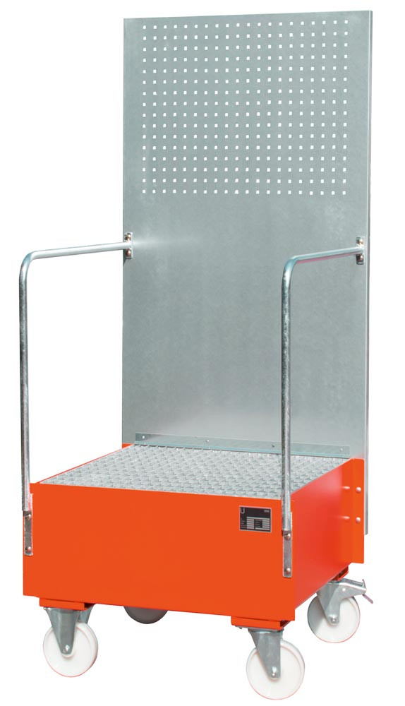 Auffangwanne mit Lochplatte, 3 mm Stahlblech, RAL 3000, fahrbar, für 1 St. 200-l-Fass, stehend Lagern, BxTxH 870x890x2110 mm, Auffangvol. 203 l