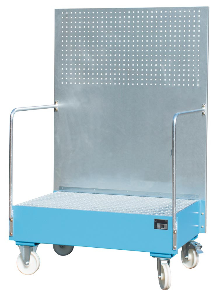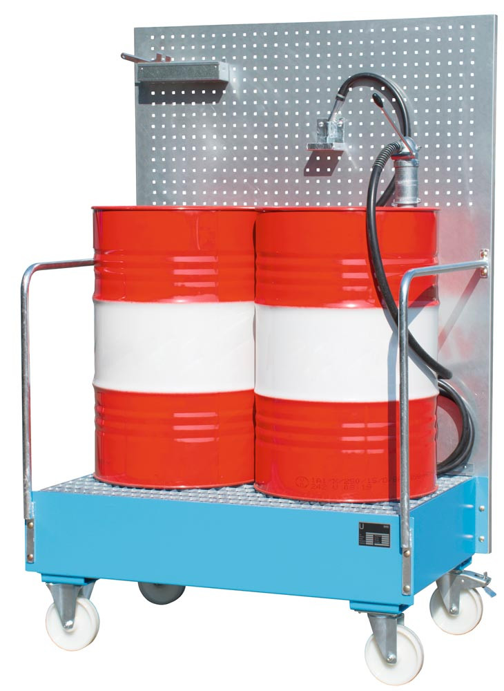Auffangwanne mit Lochplatte, 3 mm Stahlblech, RAL 5012, fahrbar, für 2 St. 200-l-Fass, stehend Lagern, BxTxH 870x1290x2015 mm, Auffangvol. 215 l
