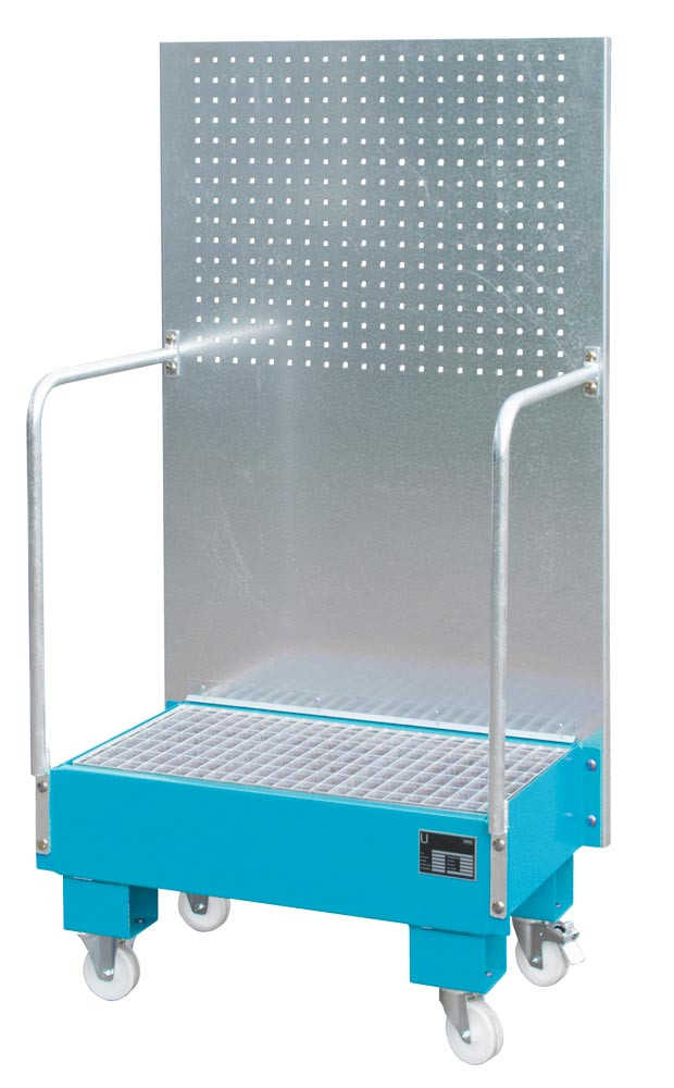 Auffangwanne mit Lochplatte, 3 mm Stahlblech, RAL 5012, fahrbar, für 2 St. 60-l-Fass, stehend Lagern, BxTxH 570x890x1685 mm, Auffangvol. 60 l