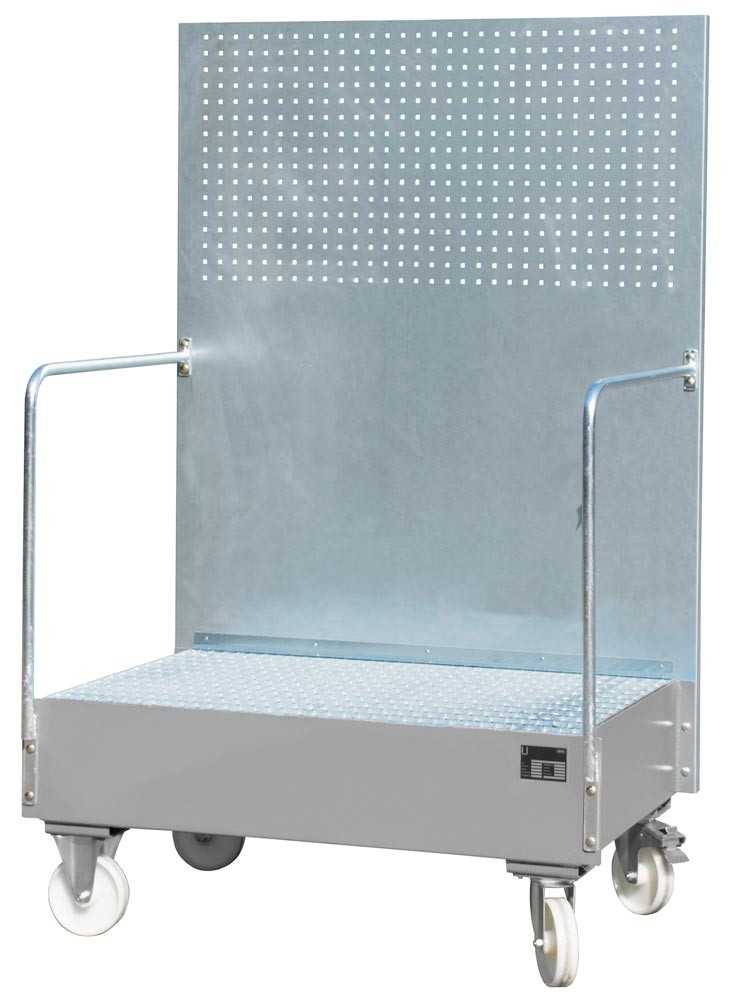 Auffangwanne mit Lochplatte, 3 mm Stahlblech, RAL 7005, fahrbar, für 2 St. 200-l-Fass, stehend Lagern, BxTxH 870x1290x2015 mm, Auffangvol. 215 l