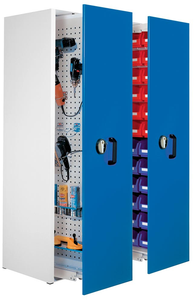 Schranksystem in XXL-Ausführung. Extra breit mit besonders viel Platz für Werkzeuge, Maschinenteile und vieles mehr.