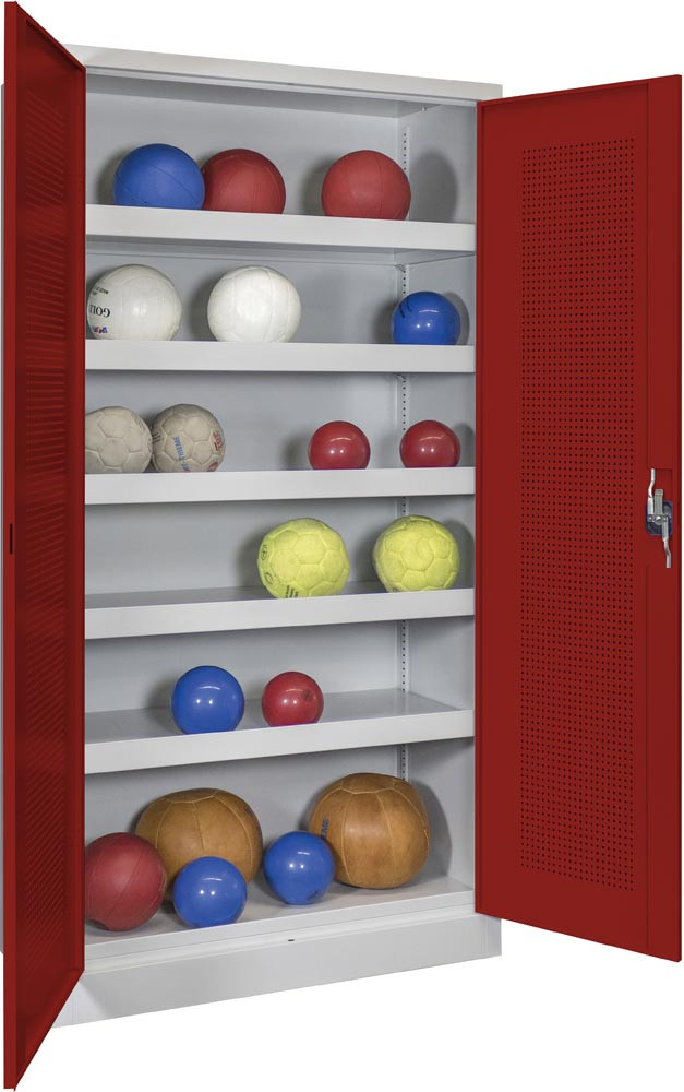 Ballschrank m. Lochblech Flügeltüren, BxTxH 1000x500x1950 mm, 5 lackierte Verstellböden mit Aufkantung, Schloss, RAL 7035/3003