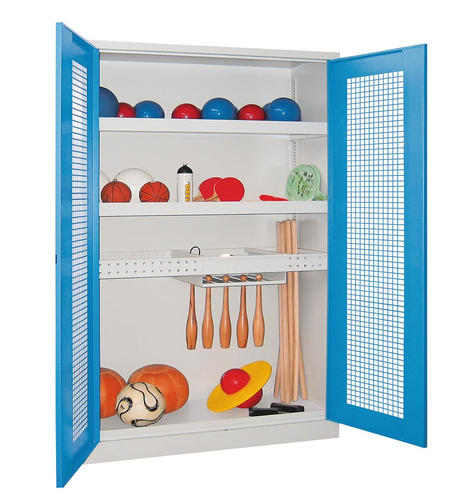 Ballschrank m. Lochblech Flügeltüren, BxTxH 1200x500x1950 mm, 2 Böden, 2 Längs- 2 Quertraversen,Trennsteg, Keulenhalter, Schloss, RAL 7035/5012