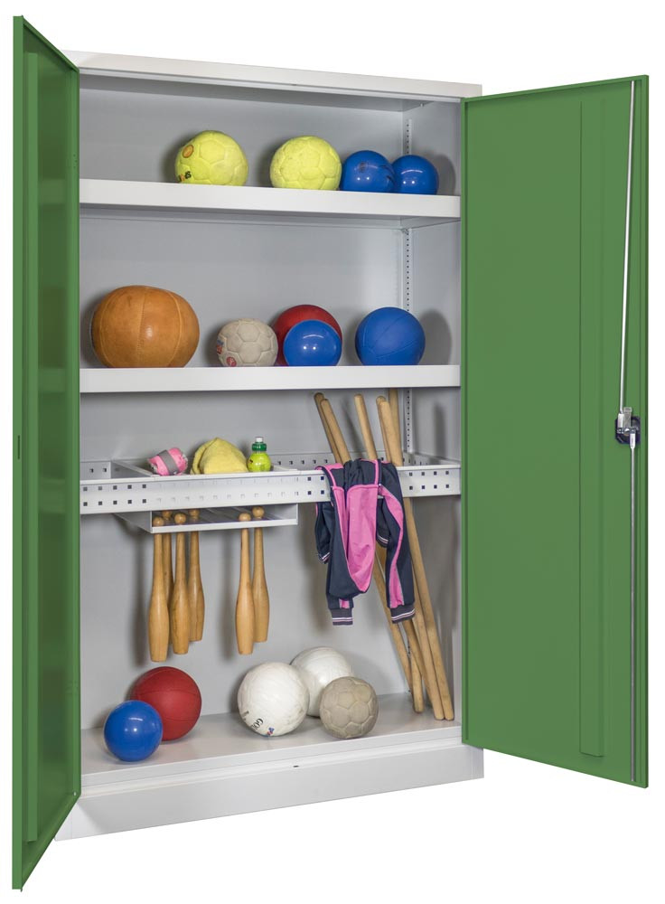 Ballschrank m. Vollblech Flügeltüren, BxTxH 1200x500x1950 mm, 2 Böden, 2 Längs- 2 Quertraversen,Trennsteg, Keulenhalter, Schloss, RAL 7035/6011