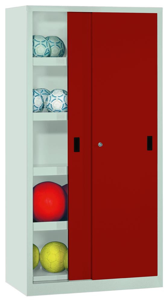Ballschrank m. Vollblech Schiebetüren, BxTxH 1000x600x1950 mm, 4 lackierte Böden m. Aufkantung, Schloss, RAL 7035/3003
