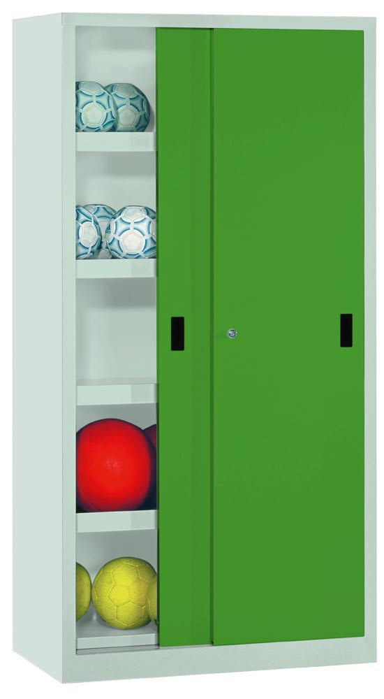 Ballschrank m. Vollblech Schiebetüren, BxTxH 1000x600x1950 mm, 4 lackierte Böden m. Aufkantung, Schloss, RAL 7035/6011 E1986988