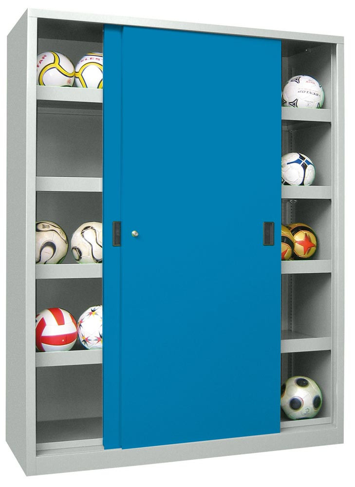 Ballschrank m. Vollblech Schiebetüren, BxTxH 1000x600x1950 mm, 4 lackierte Böden m. Aufkantung, Schloss, RAL 7035/5012 E1986986
