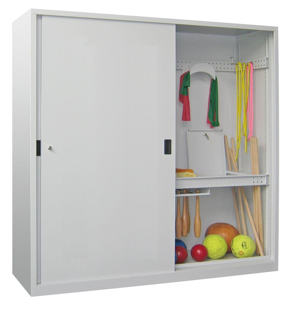 Ballschrank m. Vollblech Schiebetüren, BxTxH 2000x600x1950 mm, 4 Böden, 3 Längs- 4 Quertraversen, Wertfach, Schloss, RAL 7035 E1987009