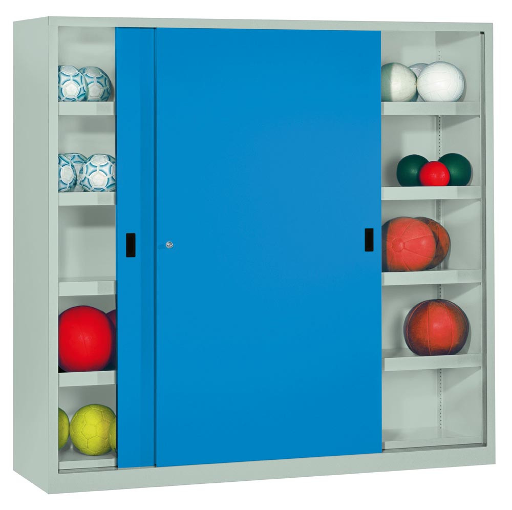 Ballschrank m. Vollblech Schiebetüren, BxTxH 1000x600x1950 mm, 4 lackierte Böden m. Aufkantung, Schloss, RAL 7035/5010 E1986985