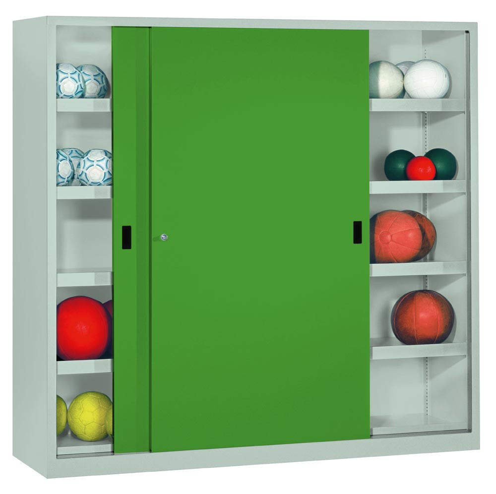 Ballschrank m. Vollblech Schiebetüren, BxTxH 1000x600x1950 mm, 4 lackierte Böden m. Aufkantung, Schloss, RAL 7035/6011 E1986988