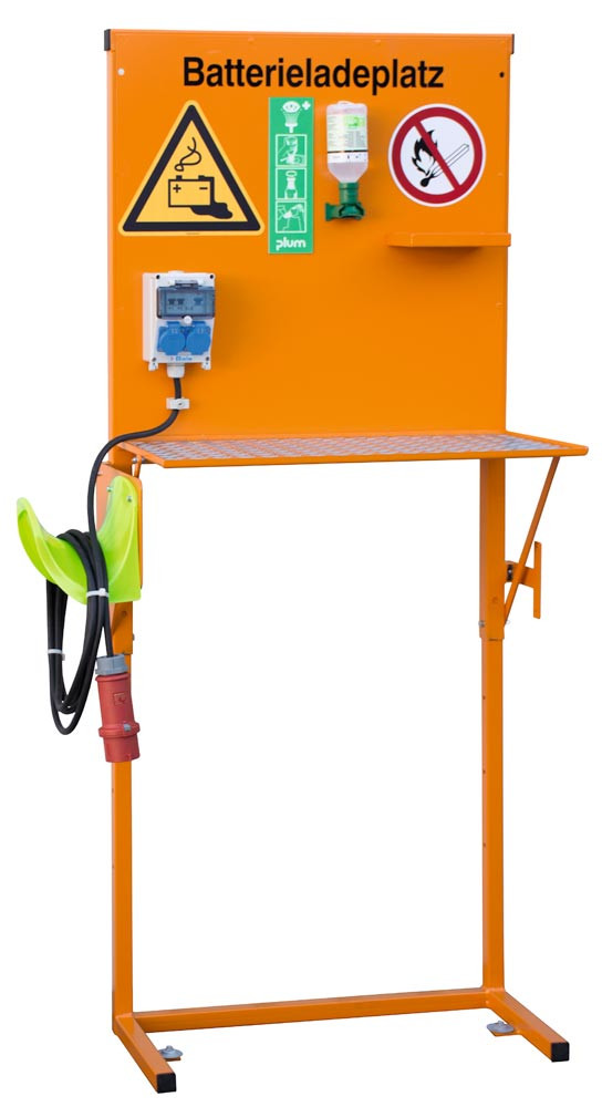 · Laden von Akkumulatoren in Flurförderzeugen gem. den Richtlinien zur Schadenverhütung: BGHW/VdS-Informationsblatt 2259 · Stabile, höhenverstellbare Rahmenkonstruktion, lackiert in RAL 2000 orange · Vorbereitet für die Boden- bzw. Wandbefestigung · Fehlerstrom-Schutzeinrichtung <= 300 mA · 2 Schuko-Steckdosen 230 V 16A · Halterung für Ladekabel · Abklappbarer Tisch für die Aufnahme von Kleinladegeräten · Ablagefach für Handschuhe und Schutzbrille · Augenspülflasche · Inkl. Warnschilder · Abmessung B x T x H 915 x 445 x 1945 mm