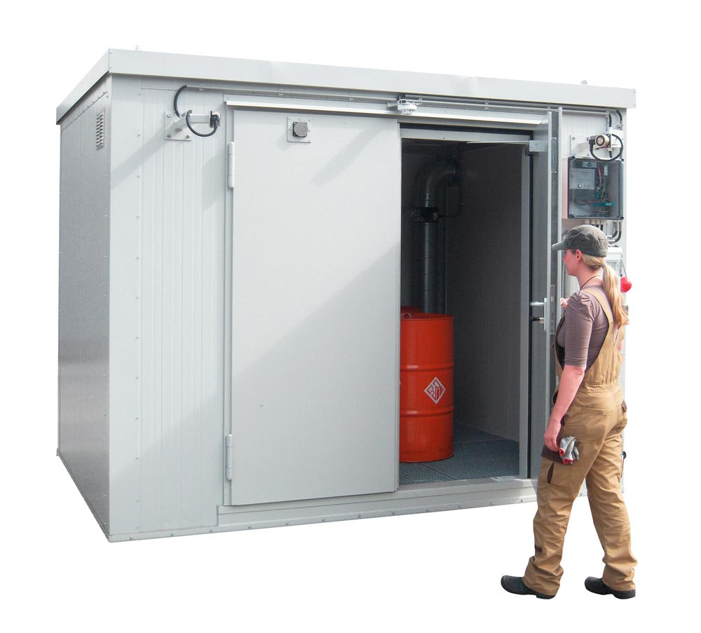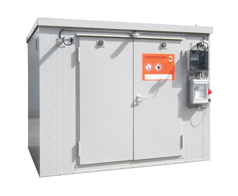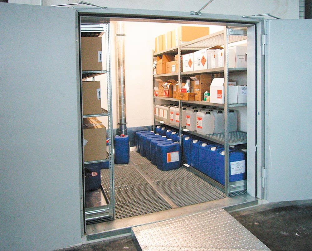 ∙ Zur Lagerung wassergefährdender, entzündbarer, giftiger und sehr giftiger Stoffe ∙ Feuerwiderstandsfähigkeit >90 Minuten ∙ Geeignet zur Innen- und Außenaufstellung ∙ Auffangwanne nach WHG, komplett mit Gitterrostabdeckung, begeh- und handhubwagenbefahrbar ∙ Lackierung RAL 7035 lichtgrau