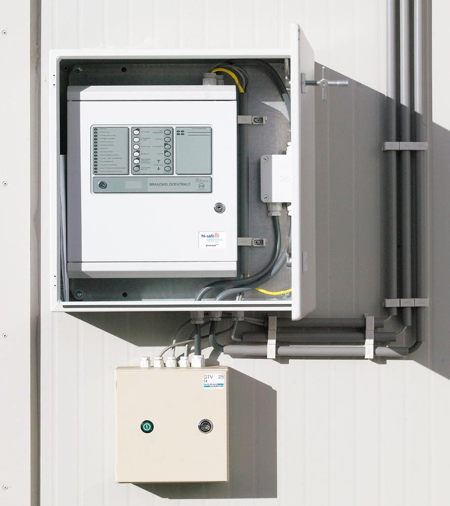 Im Brandfall: ∙ Automatische Türschließung durch Auslöseelektronik mittels Rauch-/Temperaturdifferenzmelder ∙ Alle elektrischen Einbauten einschließlich Abluftventilator werden stromlos geschaltet ∙ Türen, Türspalten, Zu- und Abluftöffnungen werden durch Temperatureinwirkung hermetisch geschlossen