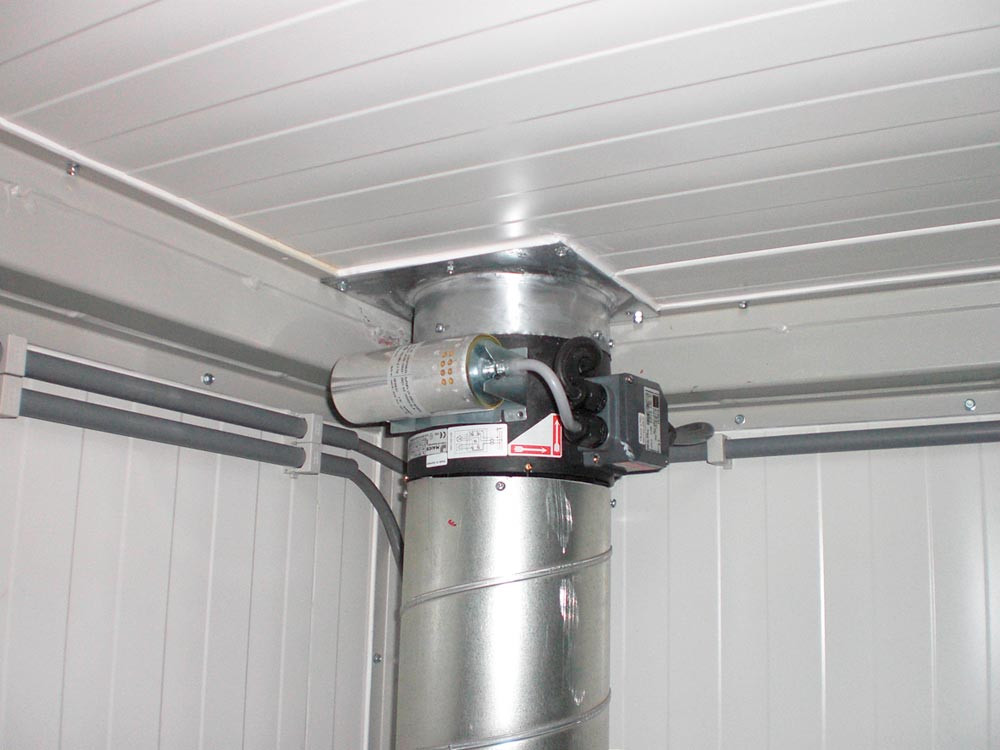 ∙ > 5-facher Luftwechsel mit automatischer Abluftüberwachung · Signal akustisch & optisch am Container ∙ Potentialausgleichsschiene außen am Container∙ Abluftführung über Dach oder Seitenwand