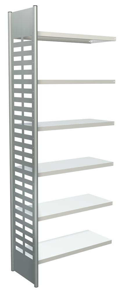 · Seitenrahmen aus Rundrohr Ø 40 mm mit verschweißten Seitenblechen, pulverbeschichtet in alusilber ähnl. RAL 9006 · Fachböden in RAL 7035 lichtgrau, mit Sicherheitskantung 40 mm hoch und höhenverstellbar im Raster von 86 mm