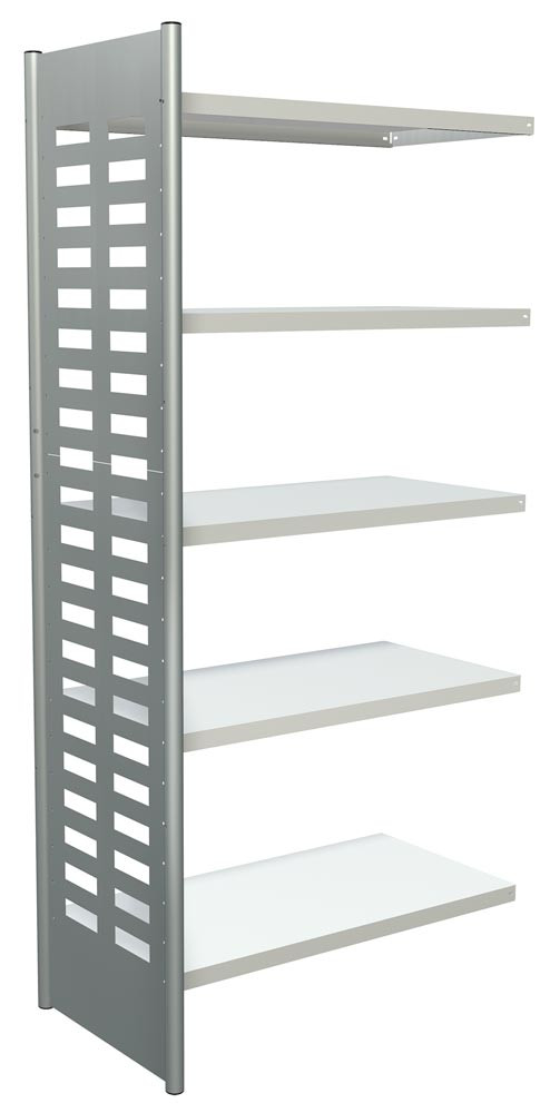 · Seitenrahmen aus Rundrohr Ø 40 mm mit verschweißten Seitenblechen, pulverbeschichtet in alusilber ähnl. RAL 9006 · Fachböden in RAL 7035 lichtgrau, mit Sicherheitskantung 40 mm hoch und höhenverstellbar im Raster von 86 mm