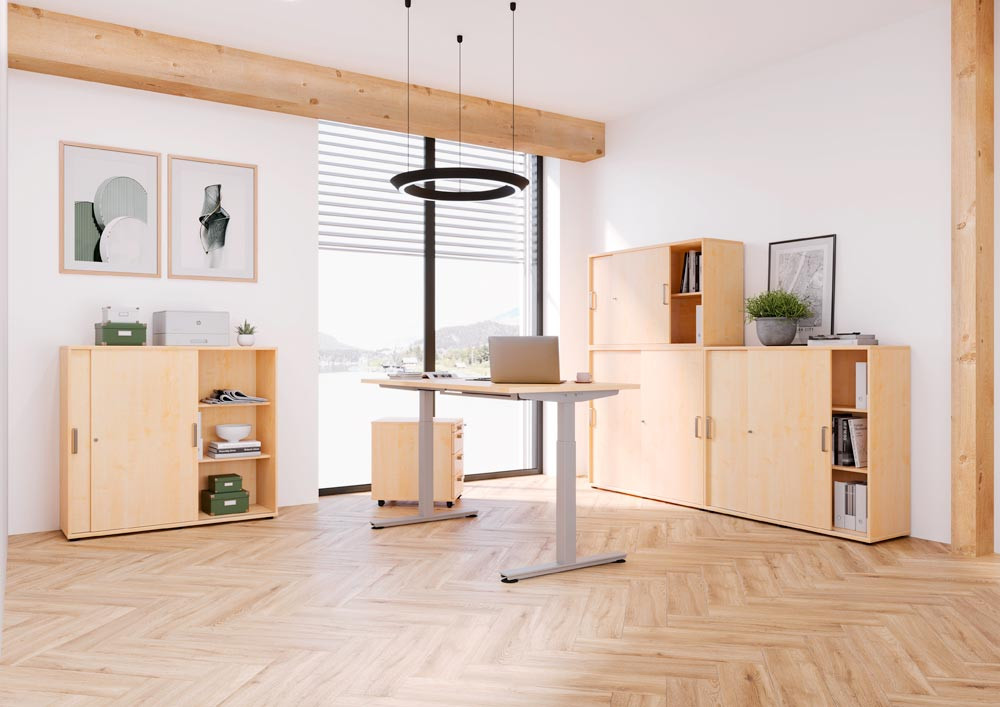 ∙ Beidseitig melaminharzbeschichtete Oberflächen, blend- und reflexarm, abriebfest und pflegeleicht ∙ Von oben verstellbare Sockelfüße zum Ausgleich von Bodenunebenheiten