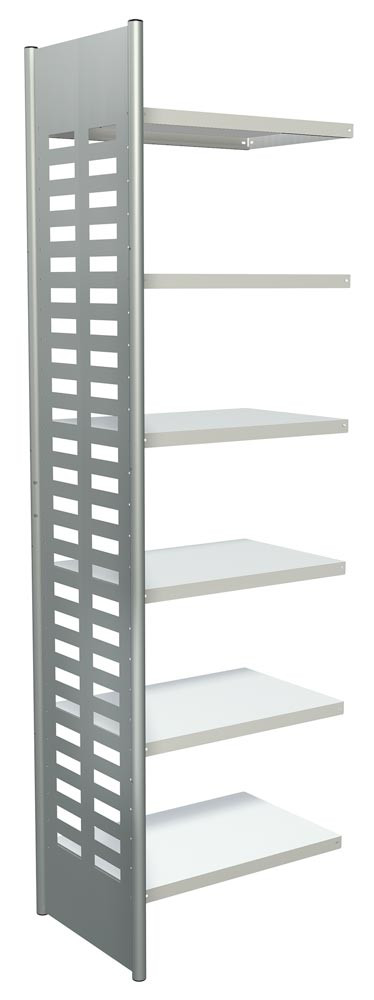 · Seitenrahmen aus Rundrohr Ø 40 mm mit verschweißten Seitenblechen, pulverbeschichtet in alusilber ähnl. RAL 9006 · Fachböden in RAL 7035 lichtgrau, mit Sicherheitskantung 40 mm hoch und höhenverstellbar im Raster von 86 mm