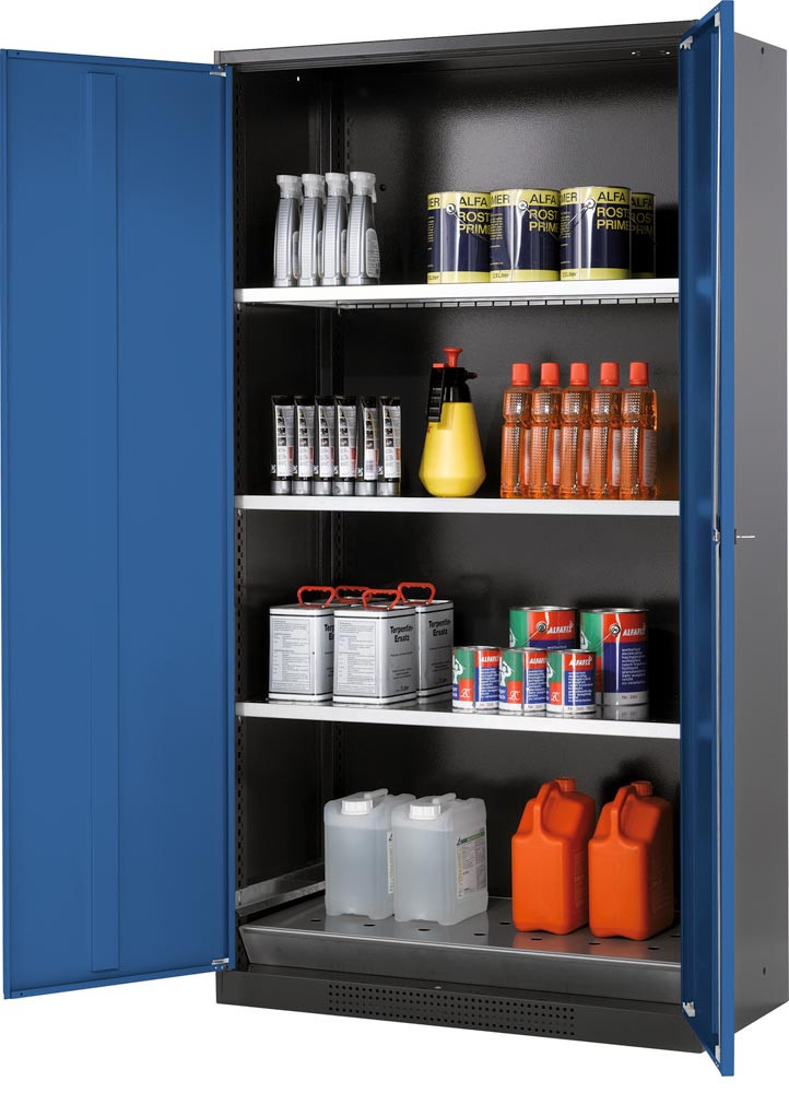 Chemikalienschrank, BxTxH 1055x520x1950 mm, 3 Böden, 1 Bodenauffangwanne mit Lochblecheinsatz, RAL 7016/RAL 5010 E1988301