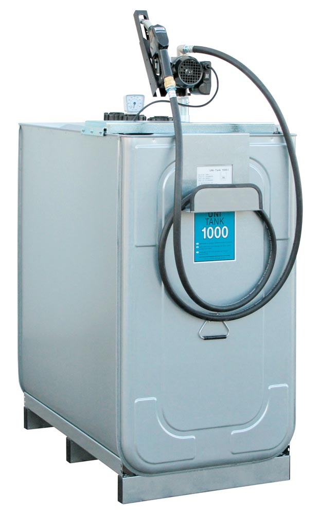 Dieseltankstation UNI, Einsteigerpaket Premium, Vol. 1000 l, Elektropumpe, 4 m Schlauch, Zapfpistole 50 l/min, BxTxH 1280x770x1750 mm
