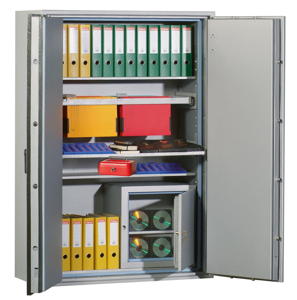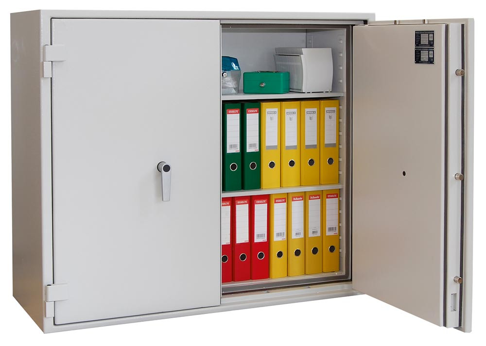 ∙ Korpus und Tür allseitig mehrwandig, Türstärke 95 mm mit allseitiger Bolzenverriegelung ∙ Beschläge und Scharniere 60 mm vorstehend ∙ Durch spezielle Füllungen und Dichtungen sind darin aufbewahrte Dokumente, Akten, Geld, etc. optimal vor Bränden und Löschwasser geschützt ∙ Die Schränke wurden an der TU Braunschweig erfolgreich einer Feuerwiderstand- und Sturzprüfung (Dauer 1 Stunde bis 1090 °C) unterzogen ∙ Doppelbart-Sicherheitsschloss inklusive zwei Schlüsseln ∙ Mit Bodenverankerung∙ Lackierung in RAL 7035 lichtgrau · Innentresore, Auszugböden und weiteres Zubehör gegen Mehrpreis