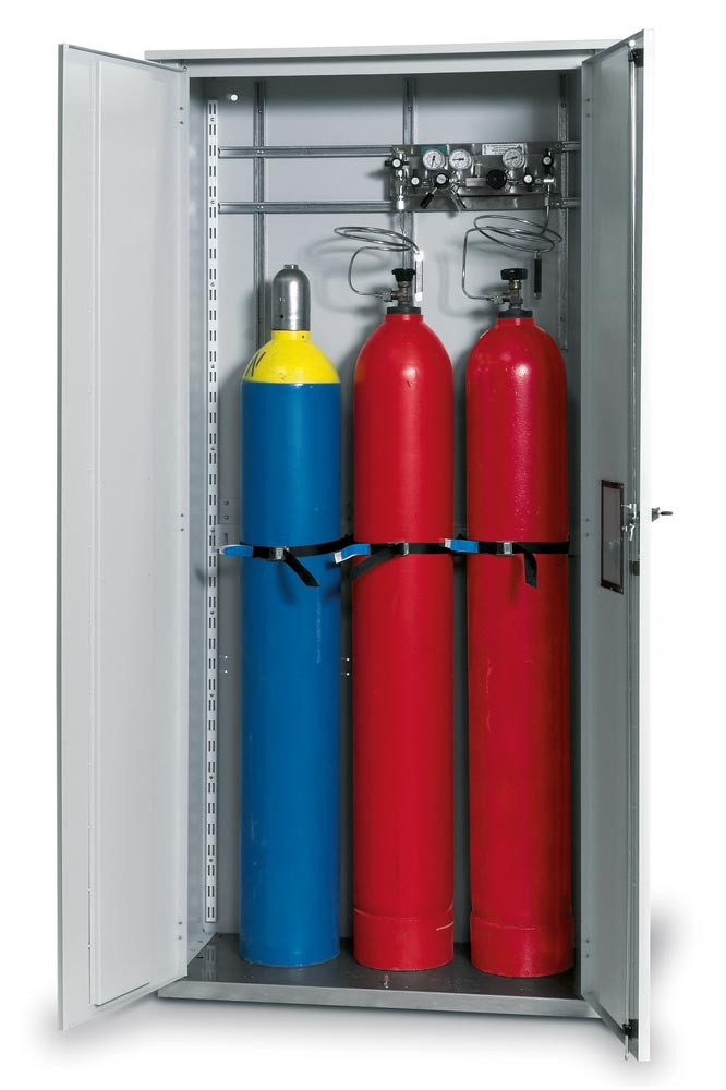 ∙ Hochwertige Stahlblechkonstruktion mit komplett verzinkter und kunststoffbeschichteter Oberfläche in RAL 7035 lichtgrau ∙ Ersetzt die geforderten Schutzbereiche (TRGS 510) um die Gasflaschen ∙ Inklusive Montageschiene, Flaschenhalter und passenden Spanngurten ∙ Edelstahlsockel zum Schutz vor Beschädigungen ∙ Stellfüße für leichtes Ausrichten bei Bodenunebenheiten ∙ Abschließbar mit solider 3-Punkt-Verriegelung über Schwenkhebel
