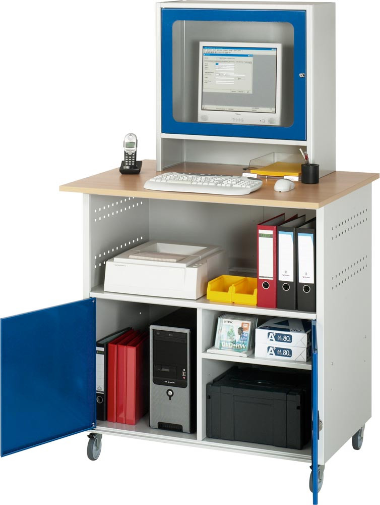 · Buche-Dekor-Arbeitsplatte (Stärke 22 mm) mit Kabeldurchlass ·Basisschrank (B x T x H 1100 x 630 x 1035 mm) oben mit offenem Ablagefach (H 415 mm) und unten mit Flügeltürfach (H 550 mm mit Doppel-Flügeltür, Öffnungsweite ca. 100°, abschließbar) inkl. auszieh- und höhenverstellbaren Einbauelementen (Tragkraft 20 kg, Auszug 80%) · Kabeldurchlässe sowie Energieleiste mit 4 Dosen und Anschlußkabel · Optional mit Monitorgehäuse lieferbar · Wahlweise stationär mit 4 Standrohren inkl. Verstellgleitern oder mobil mit 4 Lenkrollen, davon 2 mit Feststeller, Rollen-Ø 100 mm